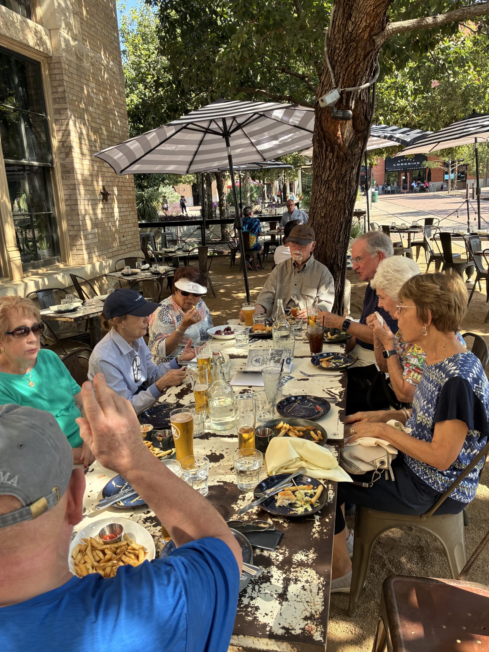 Restaurants included Mi Tierra (where the Day of the Dead costumes and 30th Anniversary cake are shown). The outdoor dining photo was at the Pearl Brewery, now multi-venue dining and event space. La Quinta Riverwalk Hotel (“host” of the last SAT reunion several years ago) again was our base camp and did not disappoint. A good time was had by all.